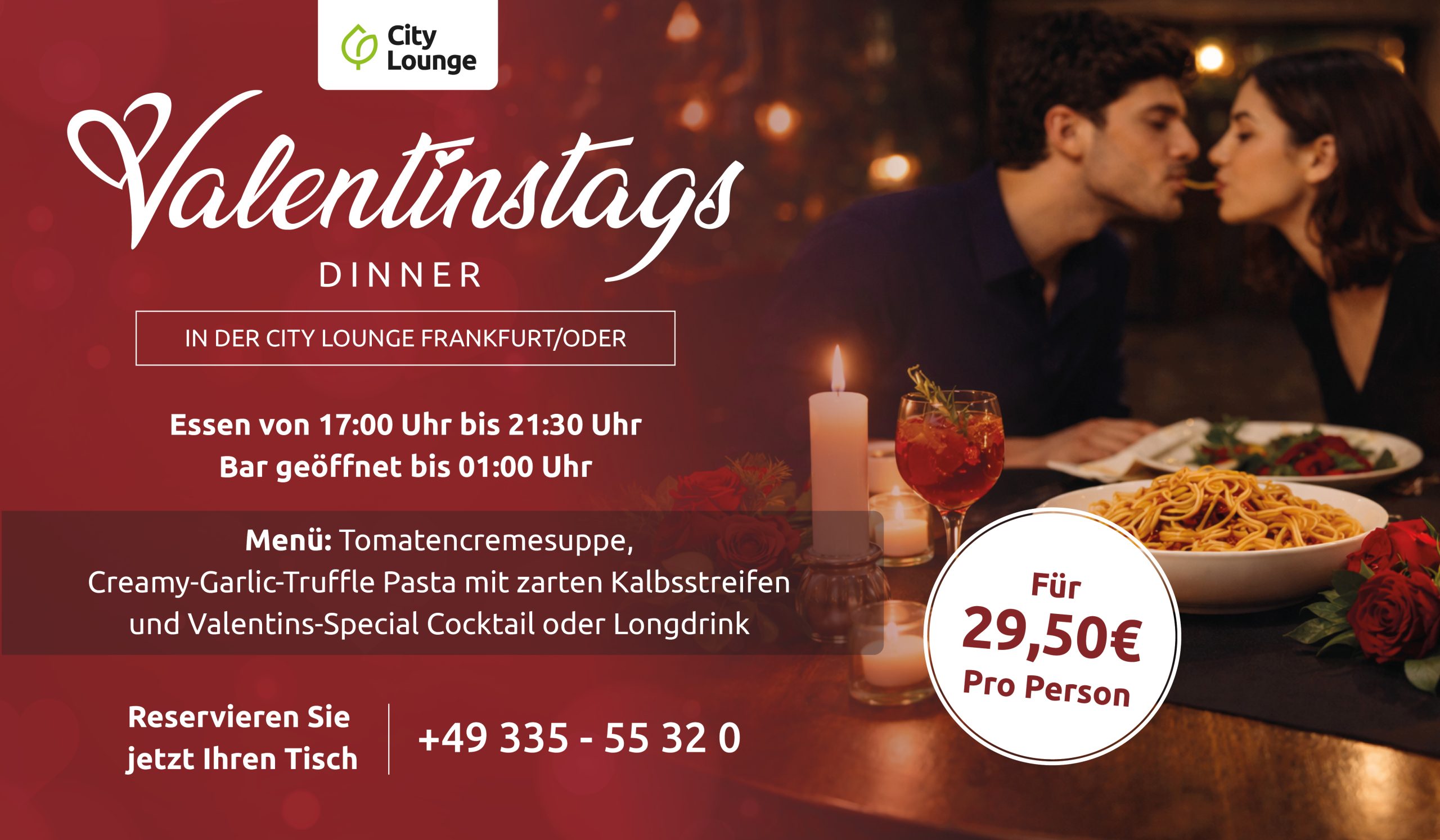 Valentinstags Dinner Genießen Sie Ihre Zweisamkeit in unserer City Lounge bei unserem kleinen Valentinstags Arrangement. MENÜ: TOMATENCREMESUPPE TRUFFLE-GARLIC-PASTA MIT ZARTEN KALBSSTREIFEN VALENTINS SPECIAL COCKTAIL ODER LONGDRINK