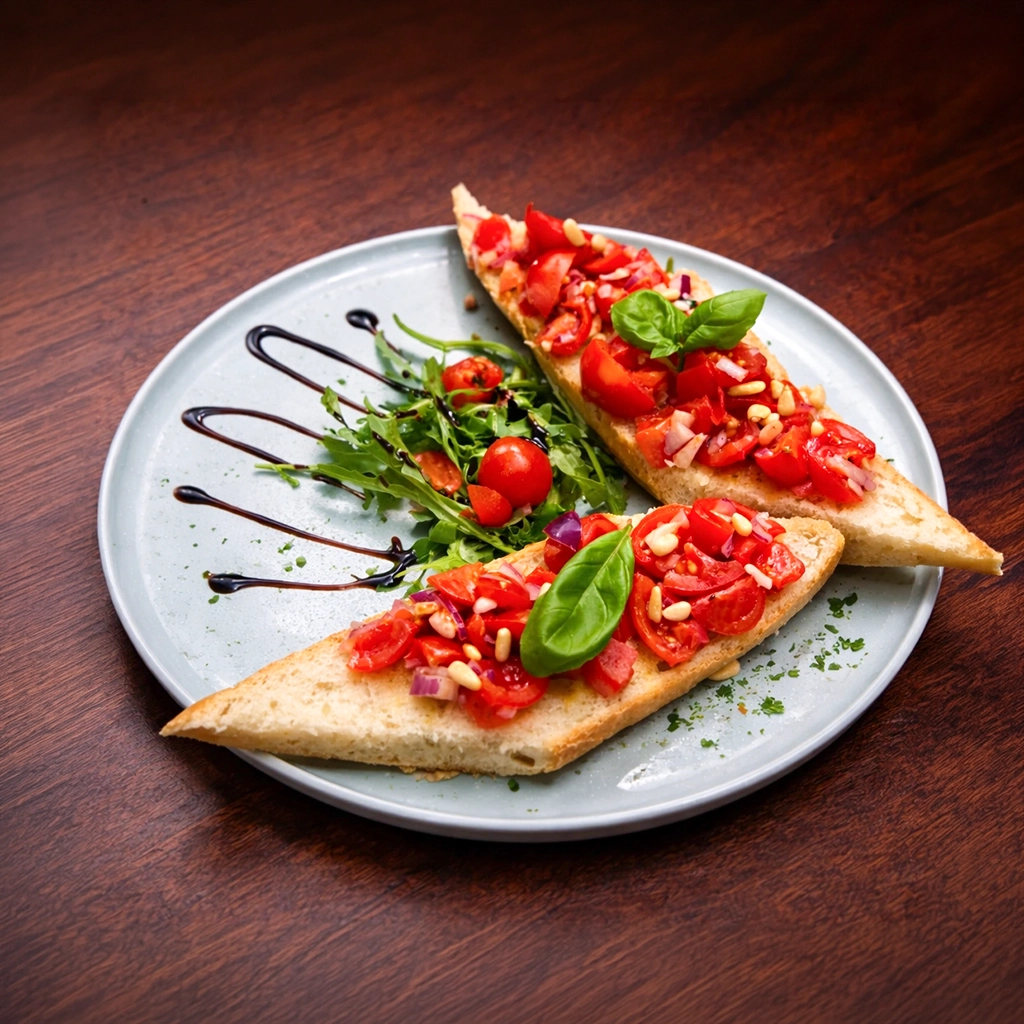 Geröstetes Knoblauchbrot mit fruchtigem Cocktailtomaten, frischem Basilikum,