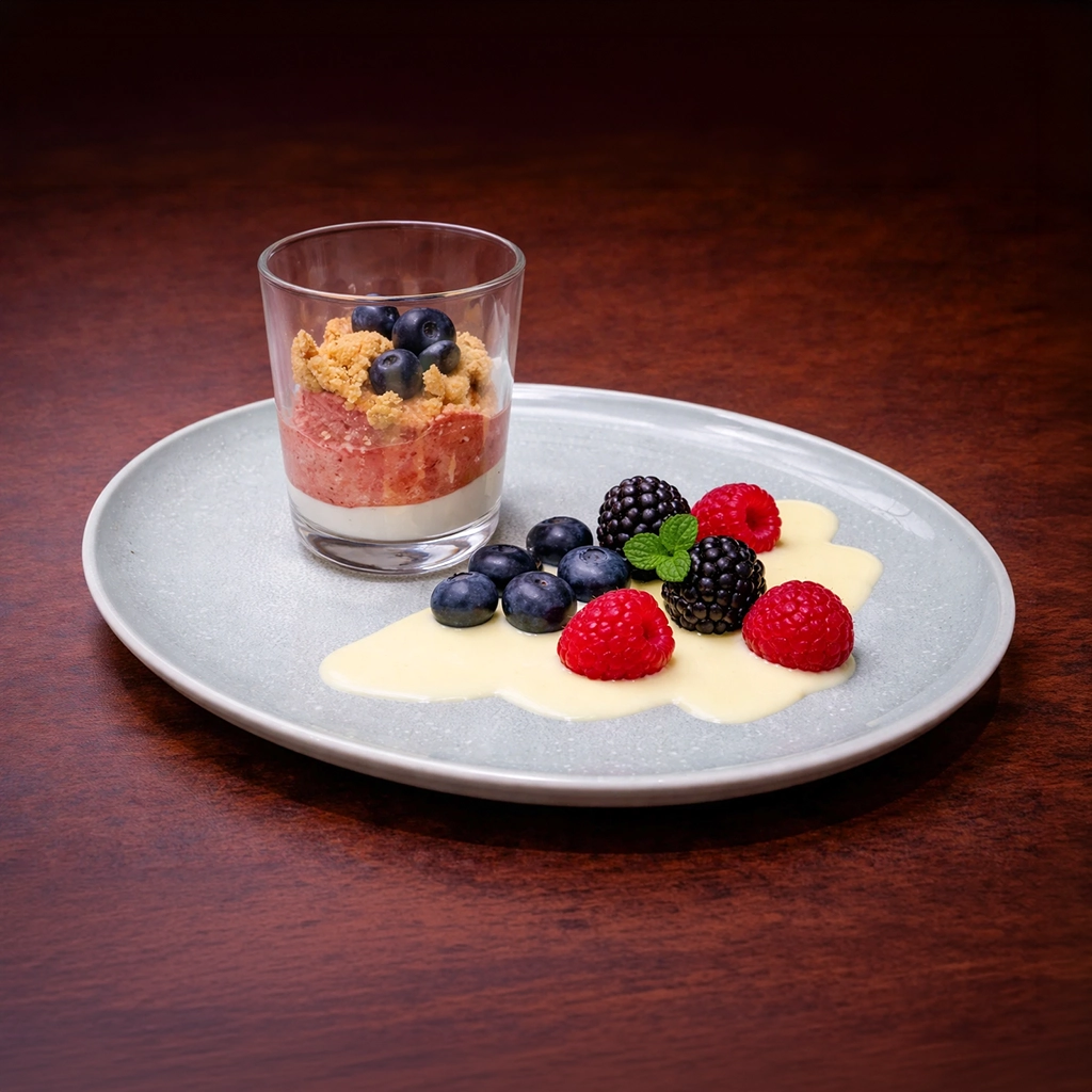 Unser Rhabarber Streusel im Glas an frischen Beeren und einem Vanillespiegel.